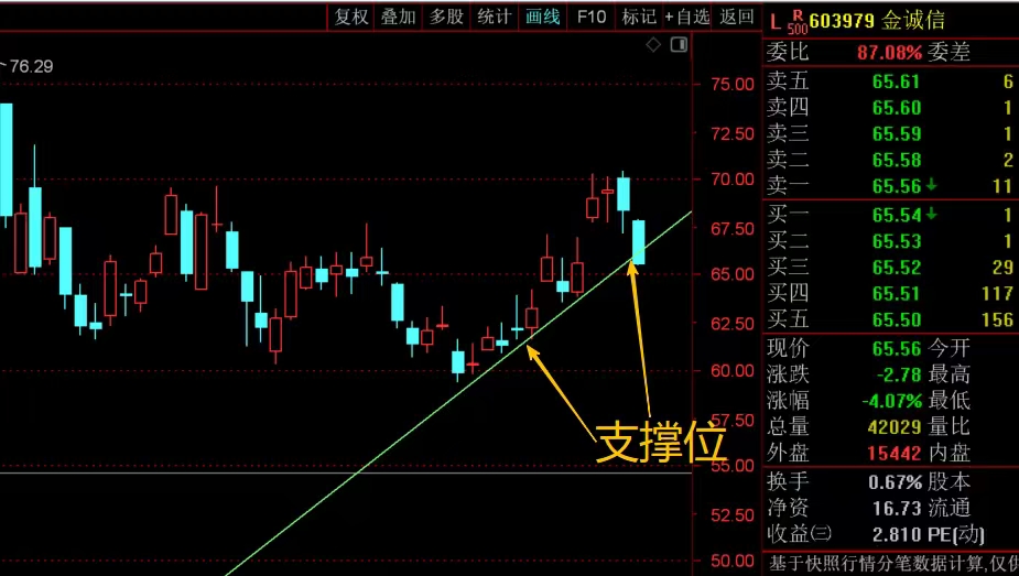 $金诚信(SH603979)$ 前两周反弹拉升得不错,但这两天回落均为多了一些,接下来重点看今天跌破的这个小趋势线能否拉回去站稳,能站稳就还行,但有效跌破就要防着继续回调的风险了,下一个支撑位就得看63.36位置附近。#复盘记录# #炒股日记#