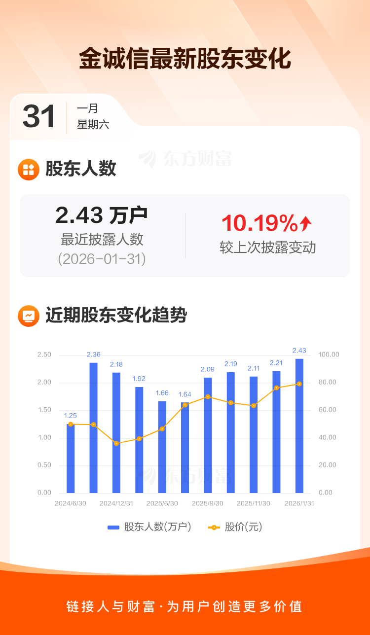 金诚信最新披露数据显示,截至1月31日公司股东户数为2.43万户,较上期(2025年12月31日)增加2248户,增幅为10.19%。户均持有流通股数量由上期的2.83万股下降至2.57万股,户均持股金额由上期的215.33万元减少至202.78万元。