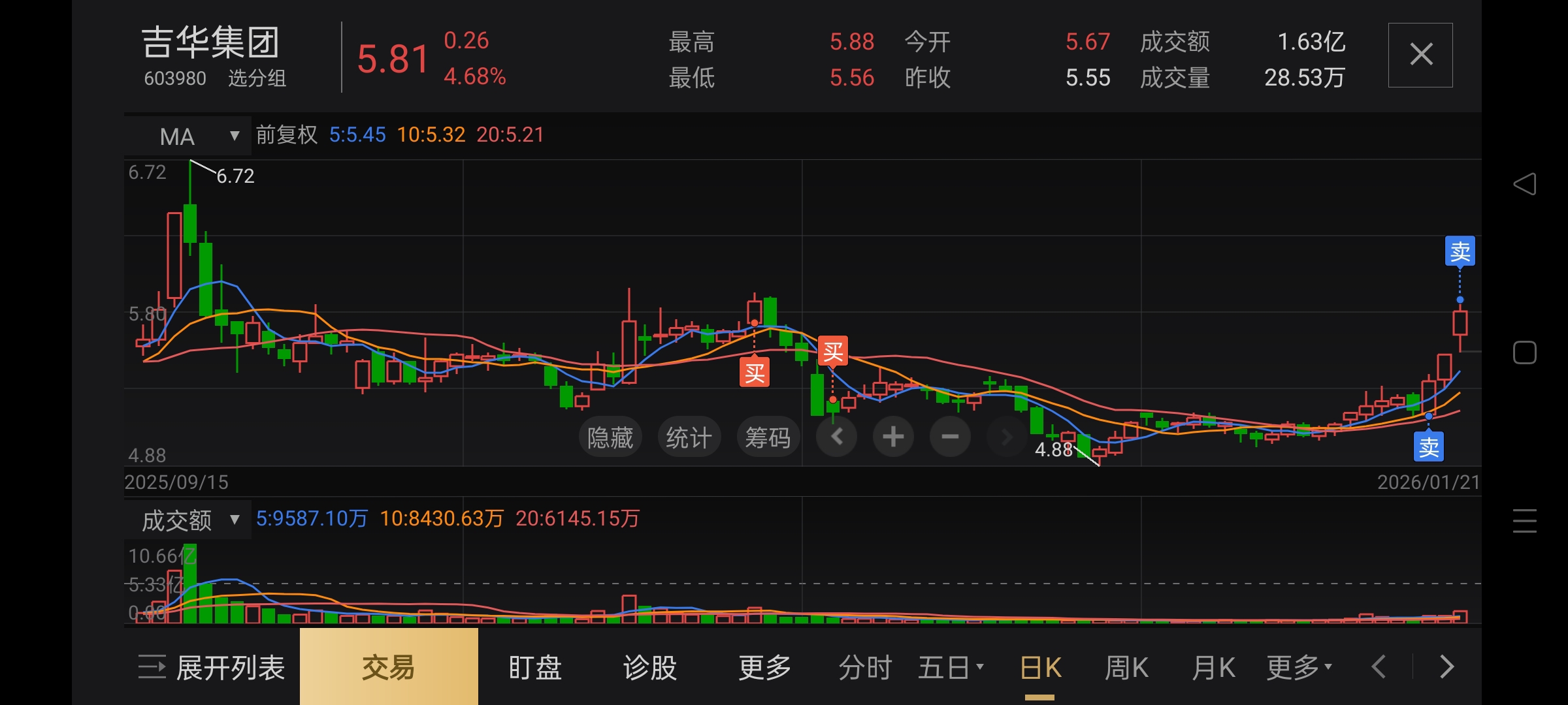 $吉华集团(SH603980)$ 终于回本了,走了,赚了几斤牛肉