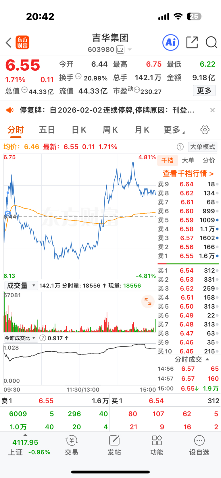 $吉华集团(SH603980)$ 时也命也 拿了半年真悲催 上午大盘不好清仓了,尾盘太忙了错过了 结果你停牌 这一次肯定历史新高了股价