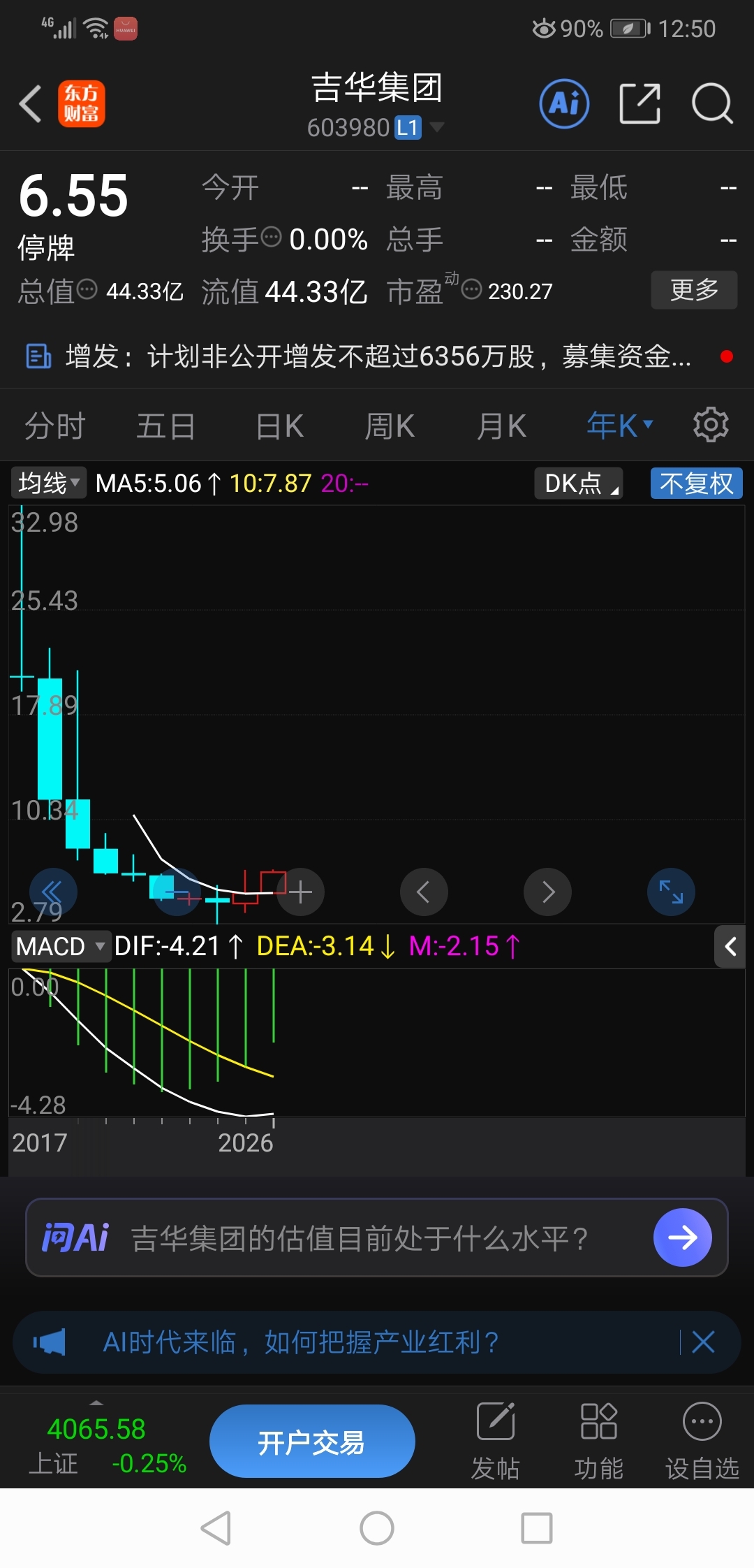 $吉华集团(SH603980)$ 历史低位,年线刚见红,后市借新主入驻等系列利好挑战高度?