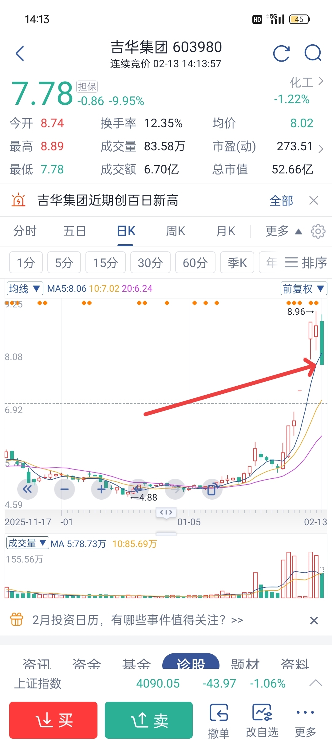 日k线上吉华集团是个一阴包多阳,这种是看跌的,按道理吉华集团是需要一个调整,调整
