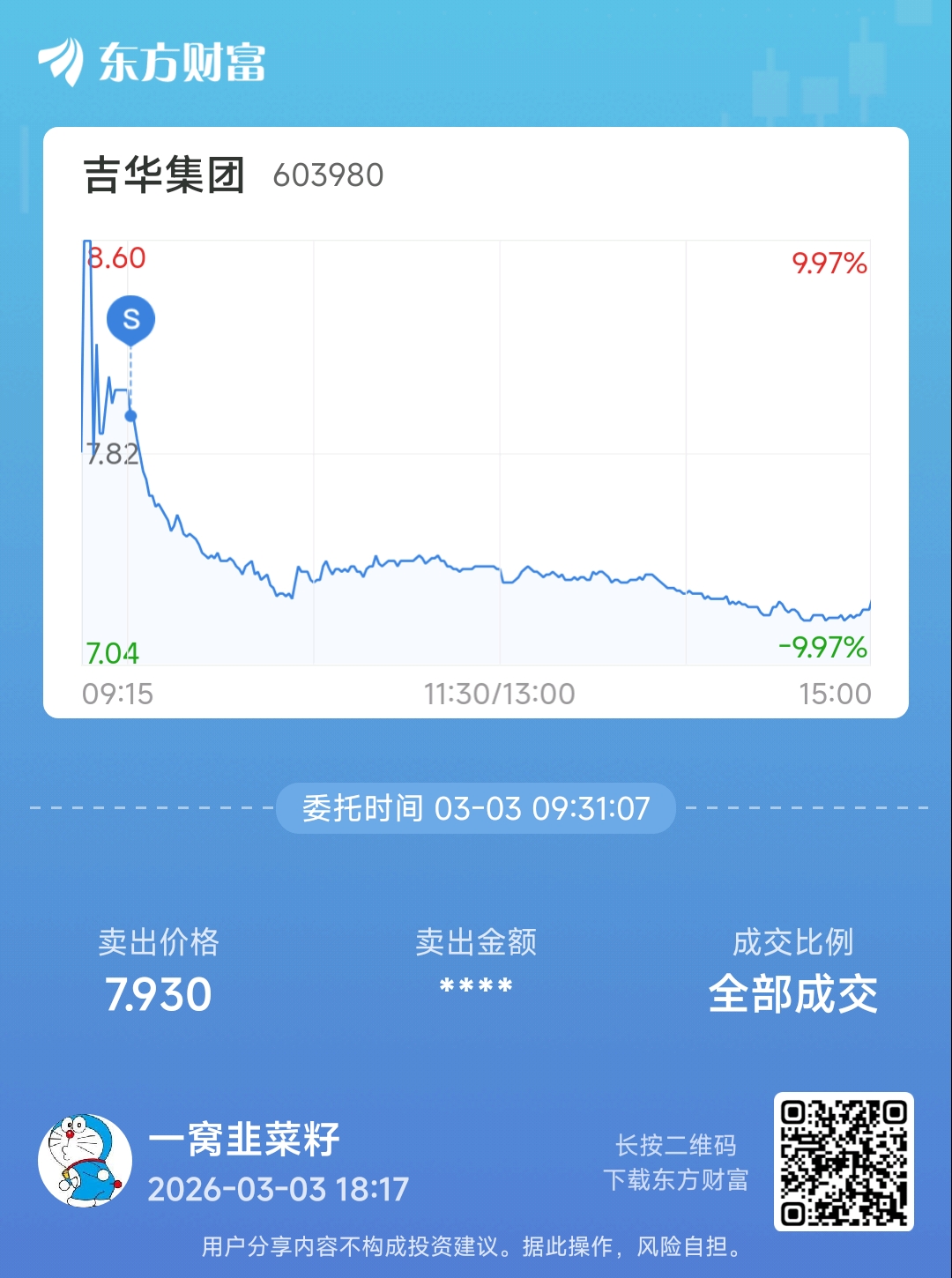 温馨提示: 1.根据《证券法》规定,禁止编造、传播虚假信息或者误导性信息,扰乱证券市场;2.用户在本社区发表的所有资料、言论等仅代表个人观点,与本网站立场无关,不对您构成任何投资建议。用户应基于自己的独立判断,自行决定证券投资并承担相应风险。《东方财富社区管理规定》