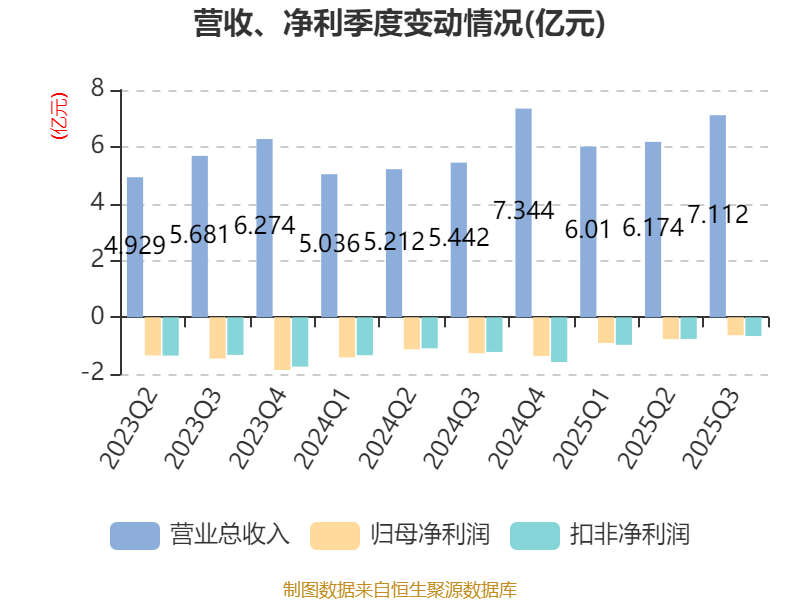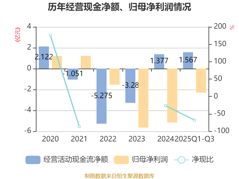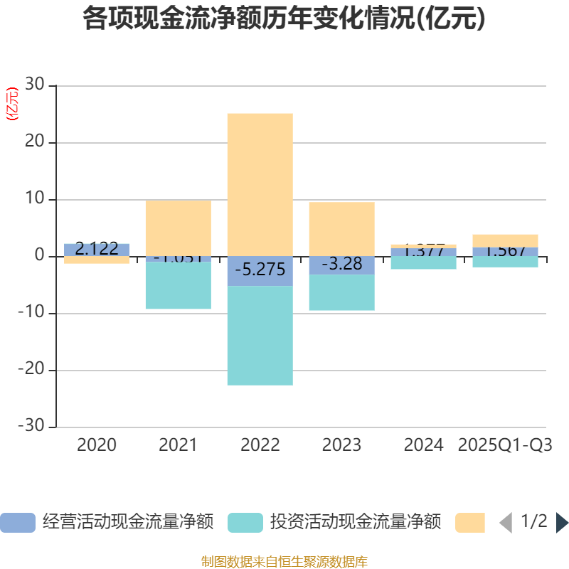 2025年前三季度,公司经营活动现金流净额为1.57亿元,同比增加3.69亿元;筹资活动现金流净额2.22亿元,同比减少9816.48万元;投资活动现金流净额-1.99亿元,上年同期为-1.52亿元。