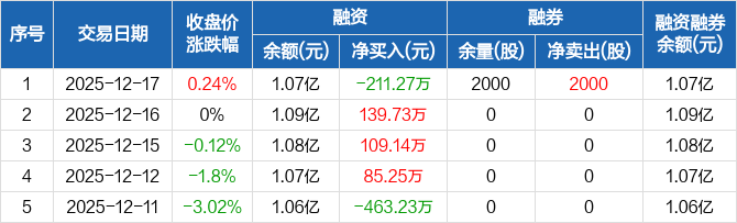 泉峰汽车:融资净偿还211.27万元,融资余额1.07亿元(12-17)