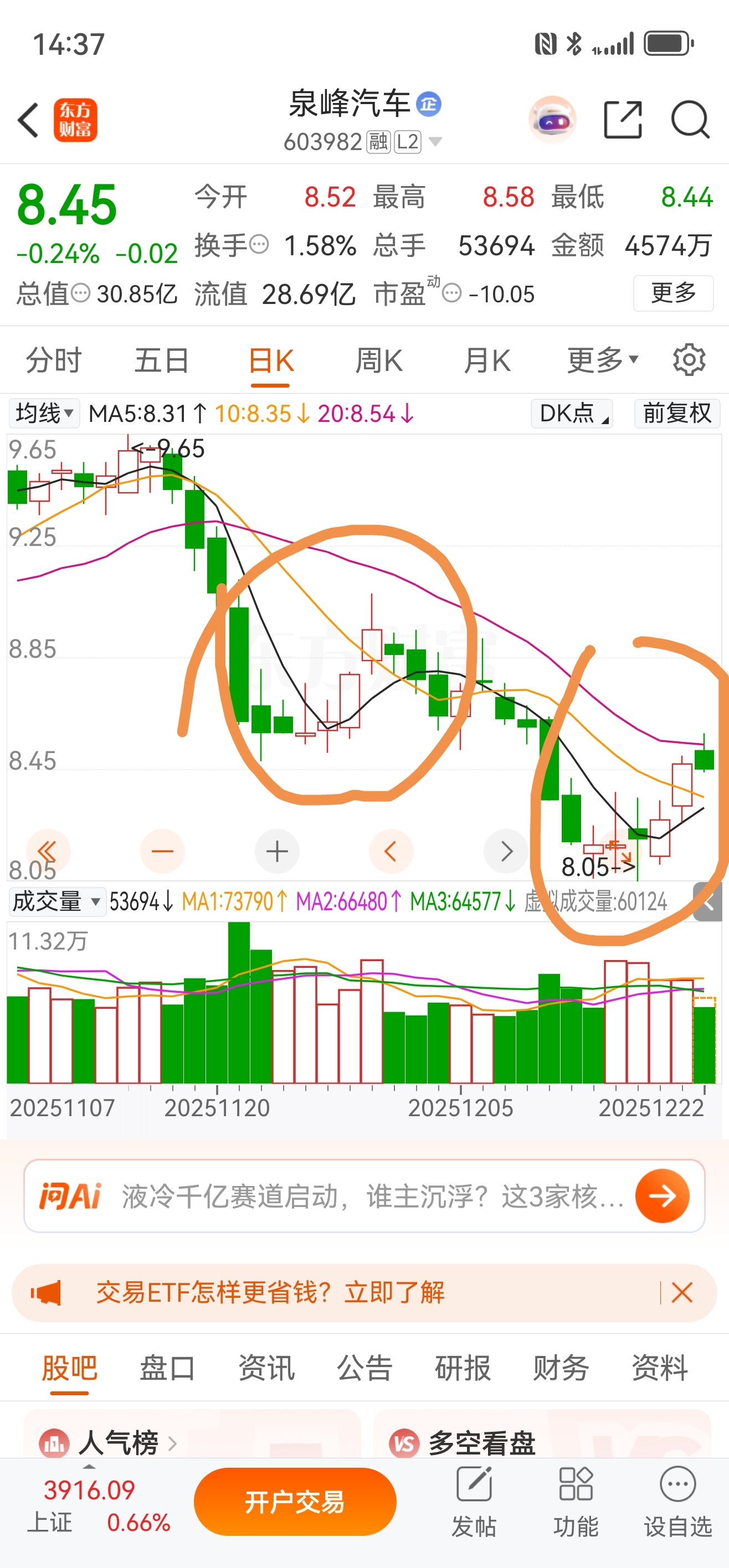 $泉峰汽车(SH603982)$ 跟前面一样反弹二天继续回来探底!这次估计破8了!