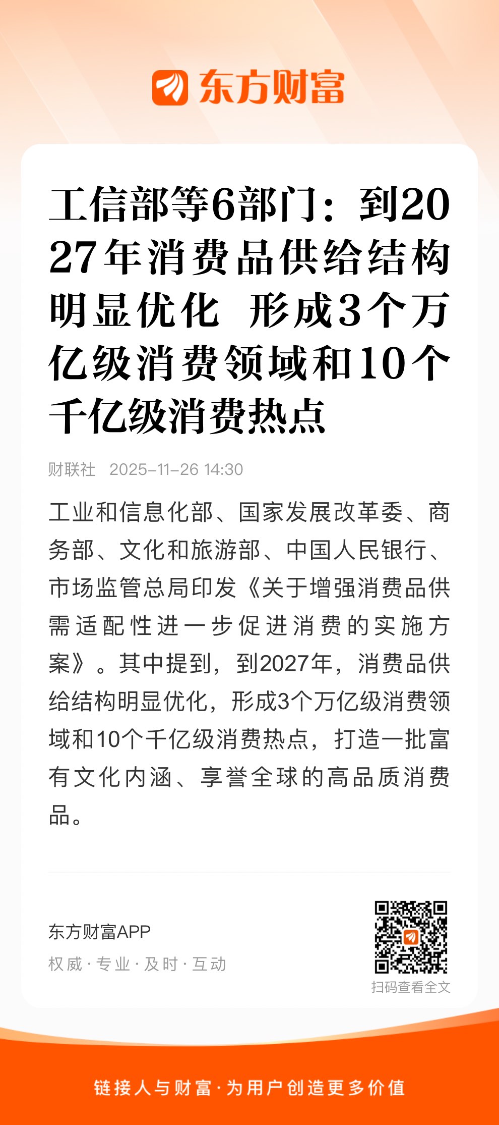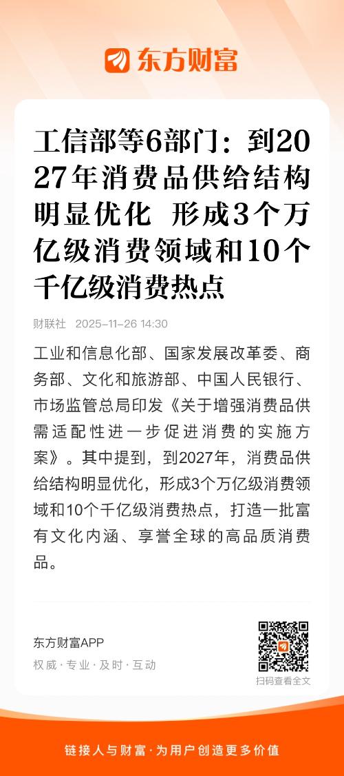 工业和信息化部、国家发展改革委、商务部、文化和旅游部、中国人民银行、市场监管总局印发《关于增强消费品供需适配性进一步促进消费的实施方案》。其中提到,到2027年,消费品供给结构明显优化,形成3个万亿级消费领域和10个千亿级消费热点,打造一批富有文化内涵、享誉全球的高品质消费品。到2030年,供给与消费良性互动、相互促进的高质量发展格局基本形成,消费对经济增长的贡献率稳步提升。