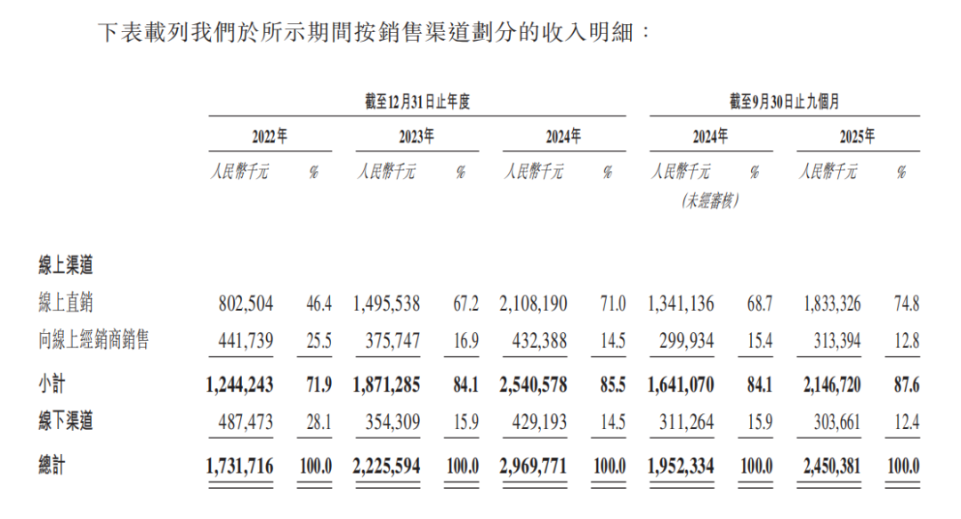 记者注意到,近年来,丸美生物加大了在线渠道销售力度。2022年至2024年及今年前九个月,公司通过在线直销产生的收入,分别占同期收入的46.4%、67.2%、71.0%、74.8%。
