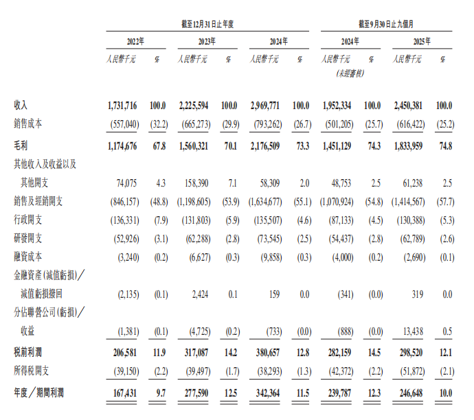 上述两大品牌支撑丸美生物实现了业绩快速增长。招股书显示,2022年至2024年,公司收入分别为17.32亿元、22.26亿元、29.7亿元,年复合增长率达31%;公司净利润分别为1.67亿元、2.78亿元、3.42亿元,年复合增长率达43%。