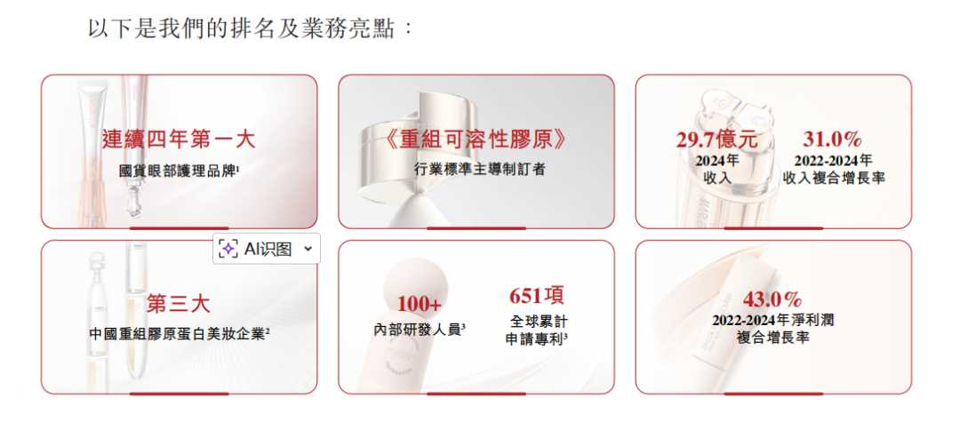招股书显示,丸美生物专注于将前沿科技创新应用到具有抗皱、紧致和修护等功效的护肤产品中。根据弗若斯特沙利文的报告,以2024年零售额计,丸美生物是重组胶原蛋白护肤品细分领域的中国第三大美妆企业。