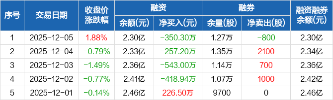 恒润股份融资融券信息显示,2025年12月5日融资净偿还350.3万元;融资余额2.3亿元,较前一日下降1.5%。