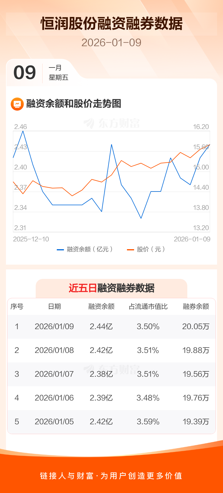 交易所最新数据显示,恒润股份于2026年1月9日获融资买入1463.29万元,融资偿还1313.58万元,当日融资净买入149.71万元。目前,该股融资余额2.44亿,占流通市值比例为3.50%。