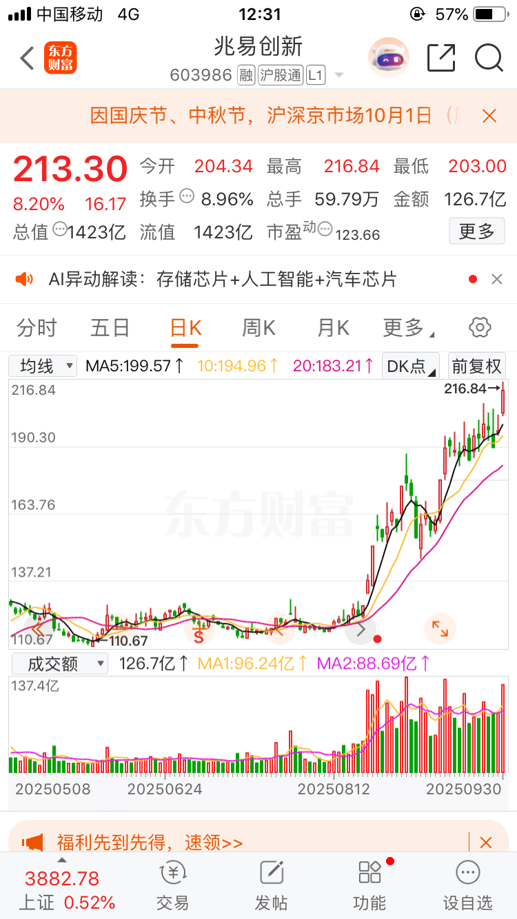 $兆易创新(SH603986)$ 兆易创新涨得不错,创出新高减半仓落袋为安,等下跌破位再分批加回去,大市值的票,要敢顺势抛与逆市捡。