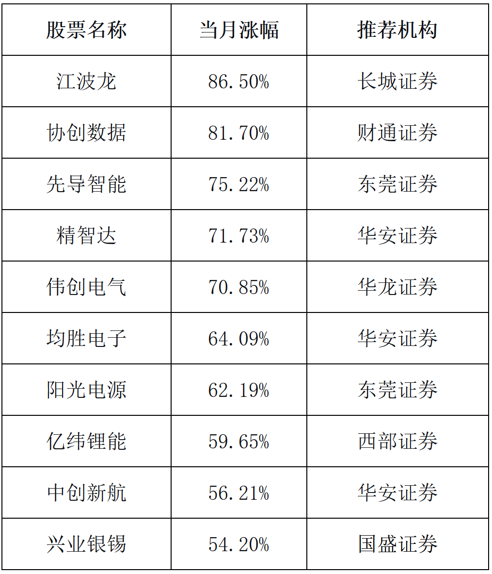 在9月金股中,长城证券推荐的江波龙当月上涨了86.5%,涨幅居于当月金股榜首;财通证券推荐的协创数据9月涨幅达到81.7%,排名第二;东莞证券推荐的先导智能以75.22%的月涨幅位居第三。
