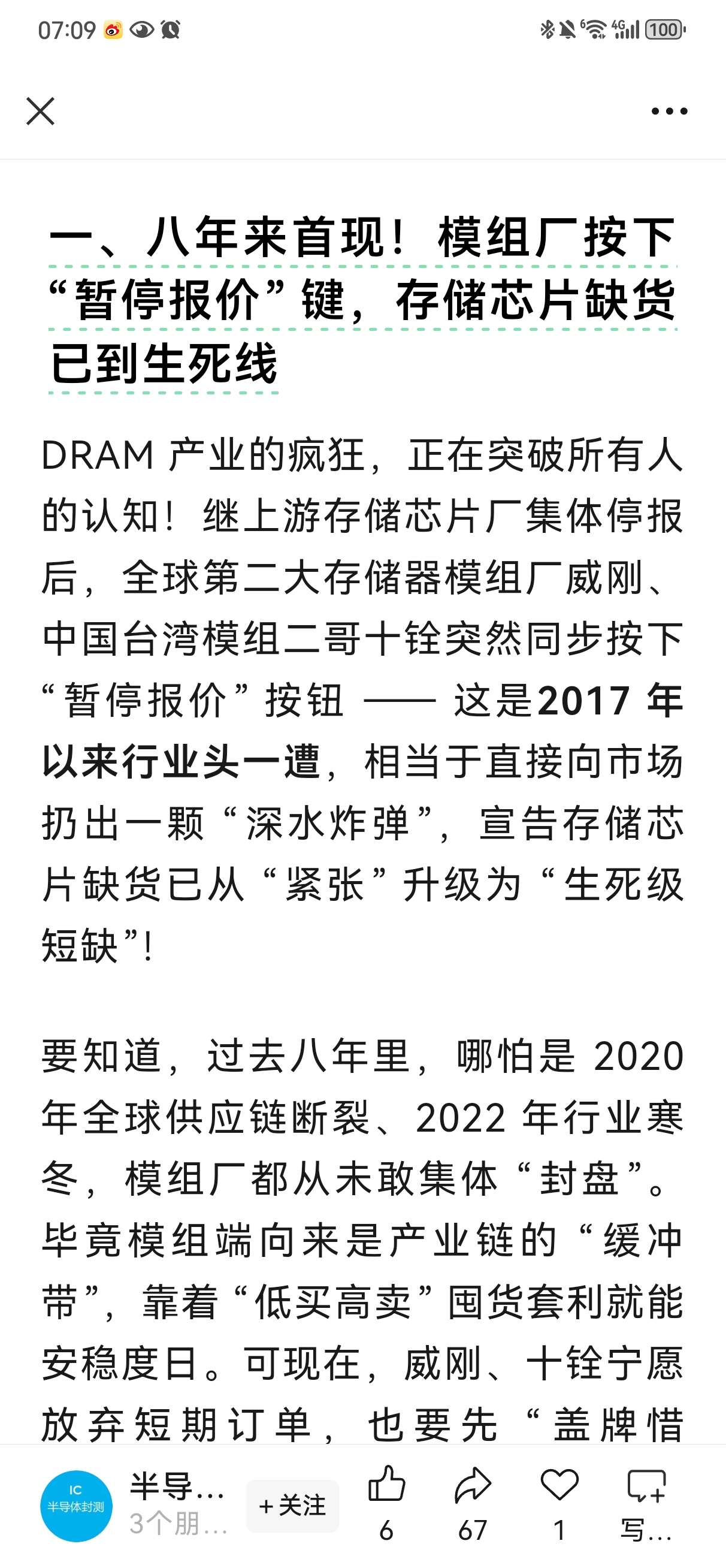 昨晚:1.存储上游公司暂停报价。2.存储下游模组公司首次暂停报价。3.昨晚美光和