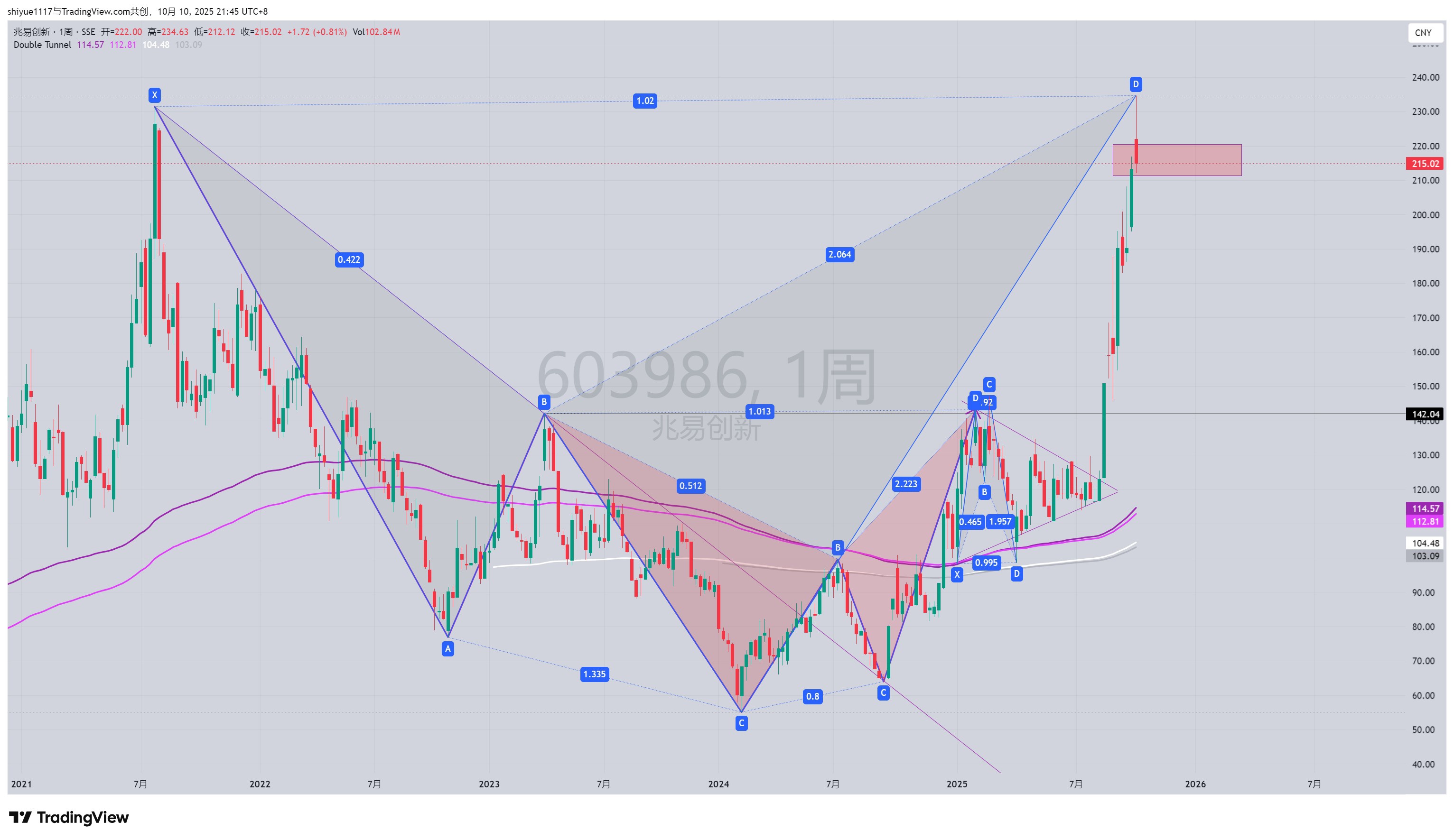 股价已经完全触碰鲨鱼形态看跌区域,即220附近