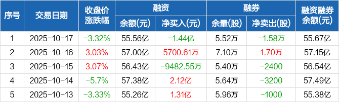 兆易创新:融资净偿还1.44亿元,融资余额55.56亿元(10-17)