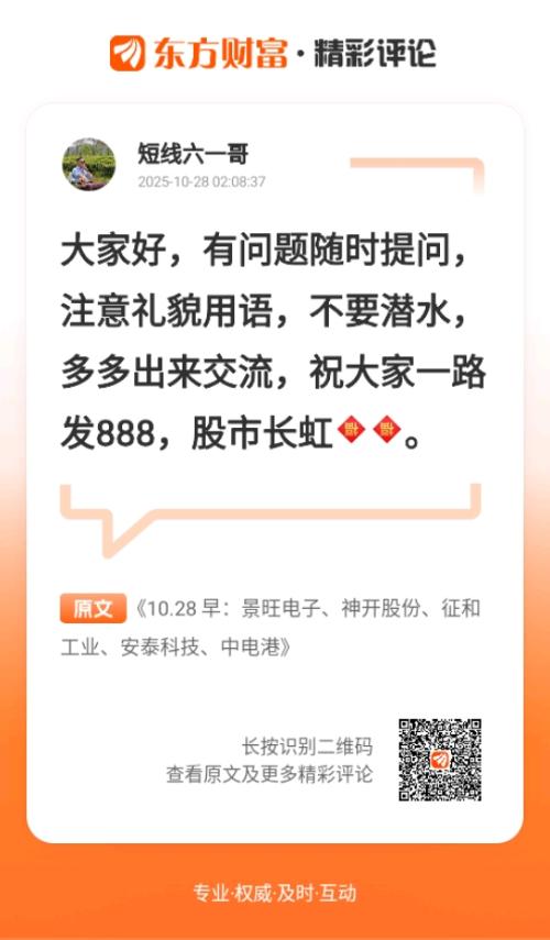 早上好//@短线六一哥 :大家好,有问题随时提问,注意礼貌用语,不要潜水,多多出来交流,祝大家一路发888,股市长虹
