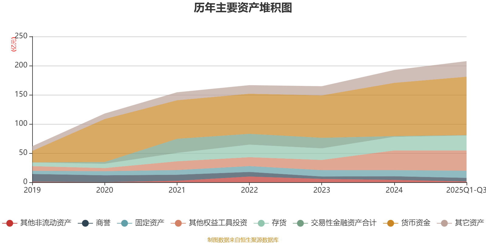 资产重大变化方面,截至2025年三季度末,公司其他非流动资产较上年末减少68.29%,占公司总资产比重下降1.48个百分点;长期股权投资较上年末增加127.9%,占公司总资产比重上升0.79个百分点;货币资金较上年末增加9.7%,占公司总资产比重上升0.77个百分点;其他权益工具投资较上年末增加3.5%,占公司总资产比重下降0.72个百分点。