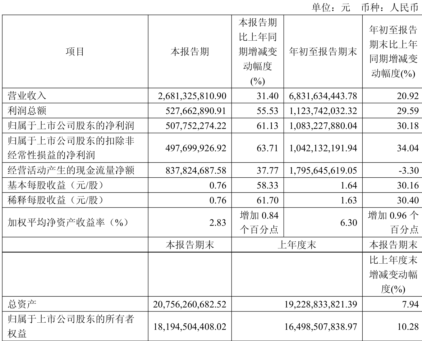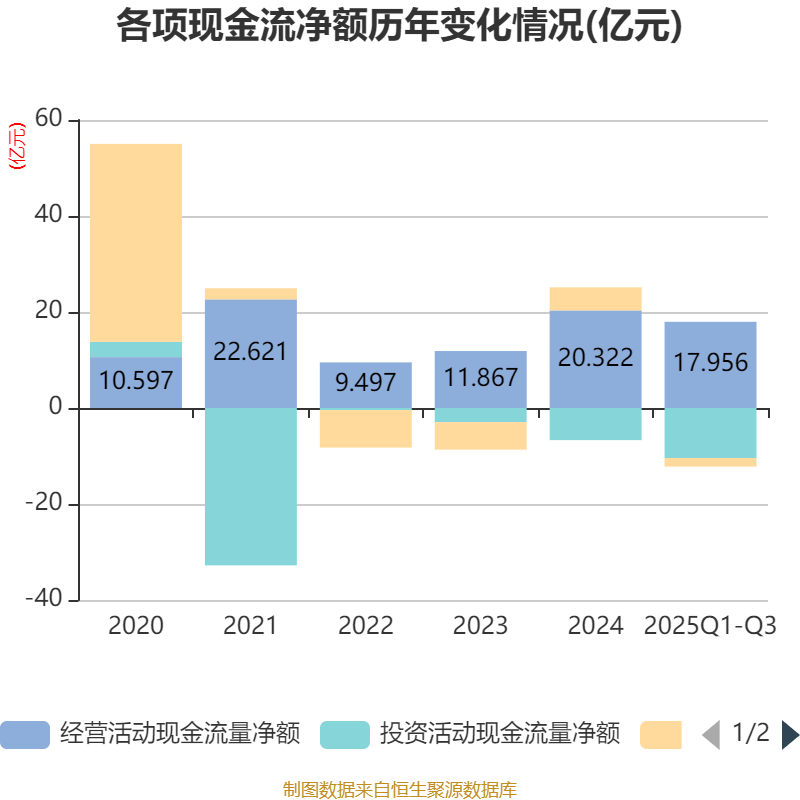 2025年前三季度,公司经营活动现金流净额为17.96亿元,同比下降3.3%;筹资活动现金流净额-1.8亿元,同比减少6.67亿元;投资活动现金流净额-10.41亿元,上年同期为-1.92亿元。