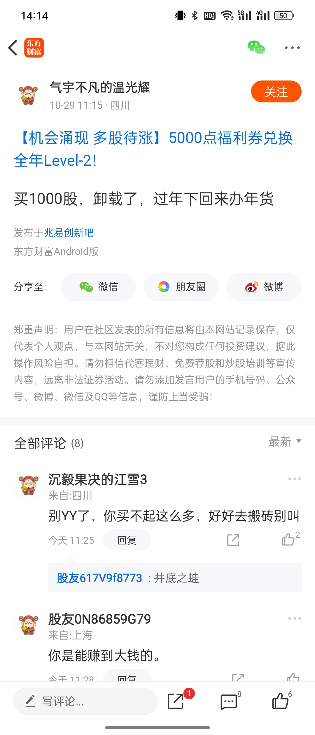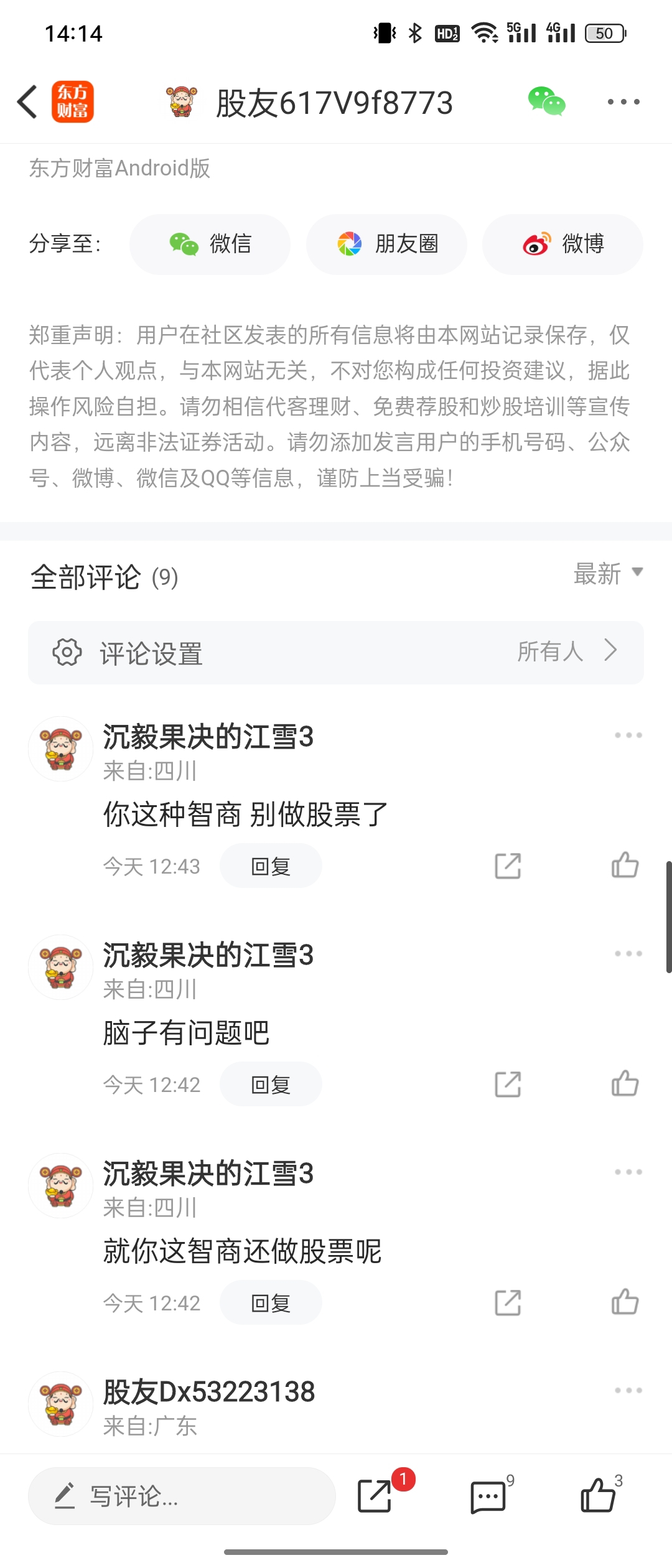 温馨提示: 1.根据《证券法》规定,禁止编造、传播虚假信息或者误导性信息,扰乱证券市场;2.用户在本社区发表的所有资料、言论等仅代表个人观点,与本网站立场无关,不对您构成任何投资建议。用户应基于自己的独立判断,自行决定证券投资并承担相应风险。《东方财富社区管理规定》