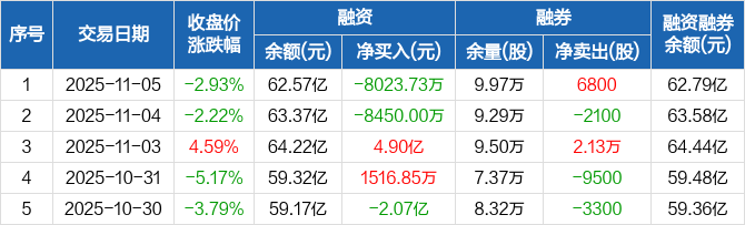 兆易创新:融资净偿还8023.73万元,融资余额62.57亿元(11-05)