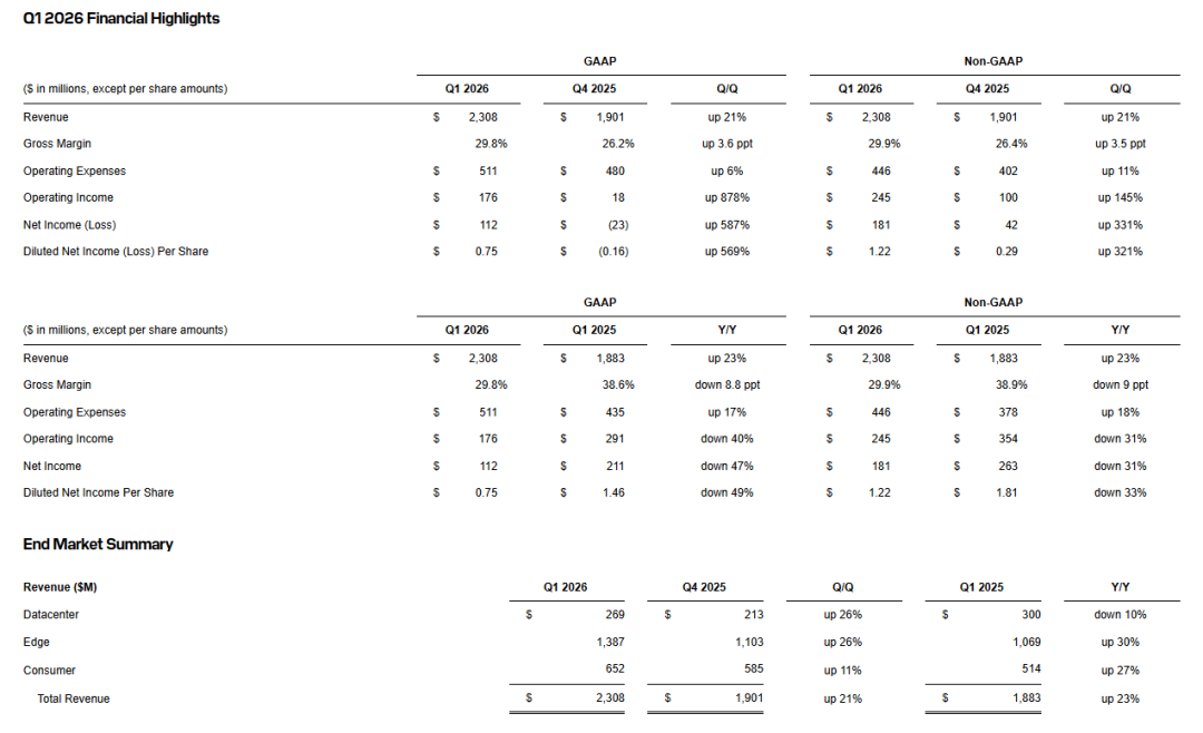 11月6日美股盘后,闪迪公布的2026财年第一财季(截至2025年10月3日)业绩超出市场预期。数据显示,第一财季,闪迪的营业收入为23.1亿美元,同比增长23%,环比增长21%;GAAP净利润为1.12亿美元,同比下降47%,环比大增587%。值得注意的是,在数据中心业务方面,闪迪第一季营收环比增长26%。