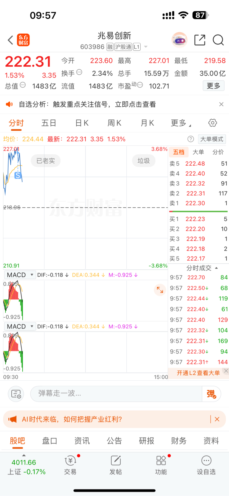 $兆易创新(SH603986)$ 兆易创新止盈离场,周五或下周再看趋势是否介入。
