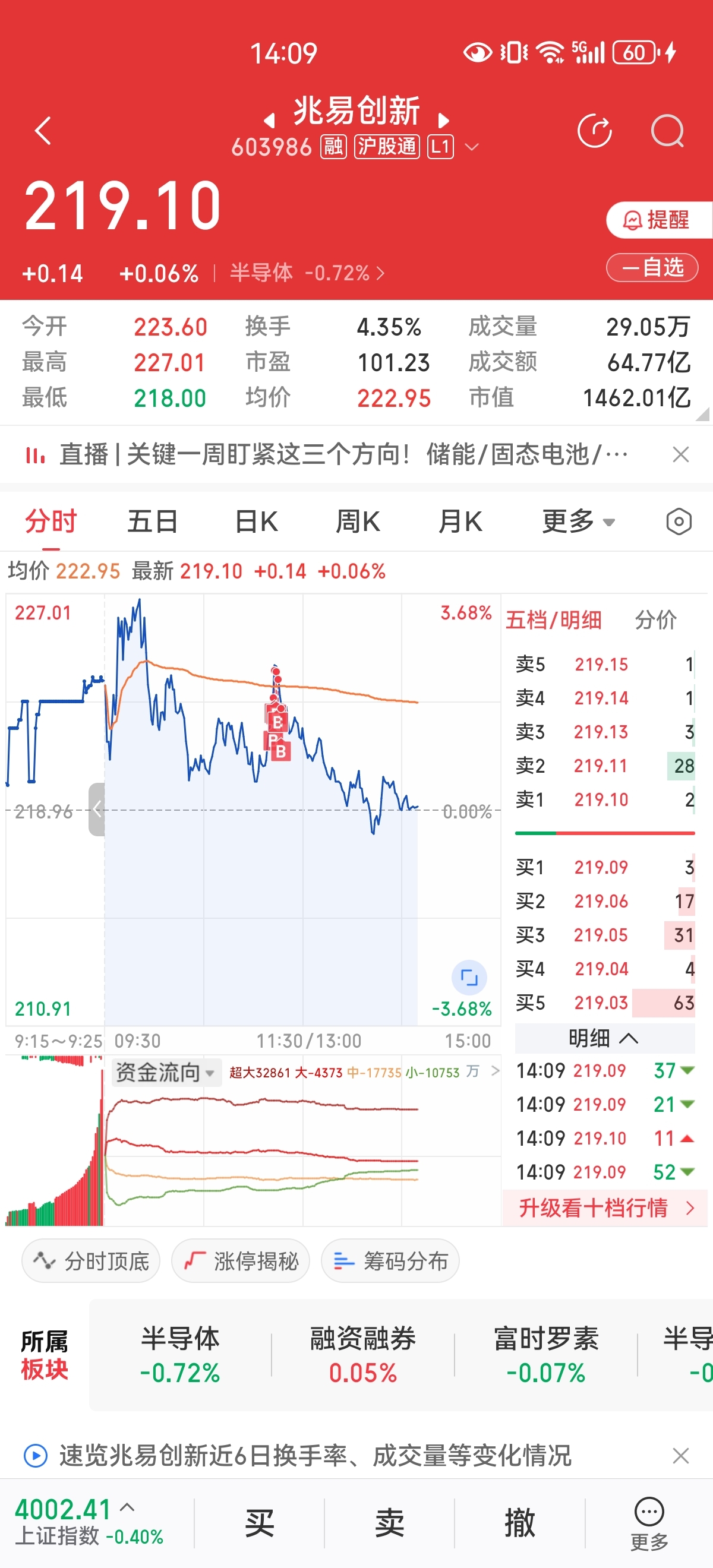 $兆易创新(SH603986)$ 买四次亏四次,这次223.85买的,亏2%以上