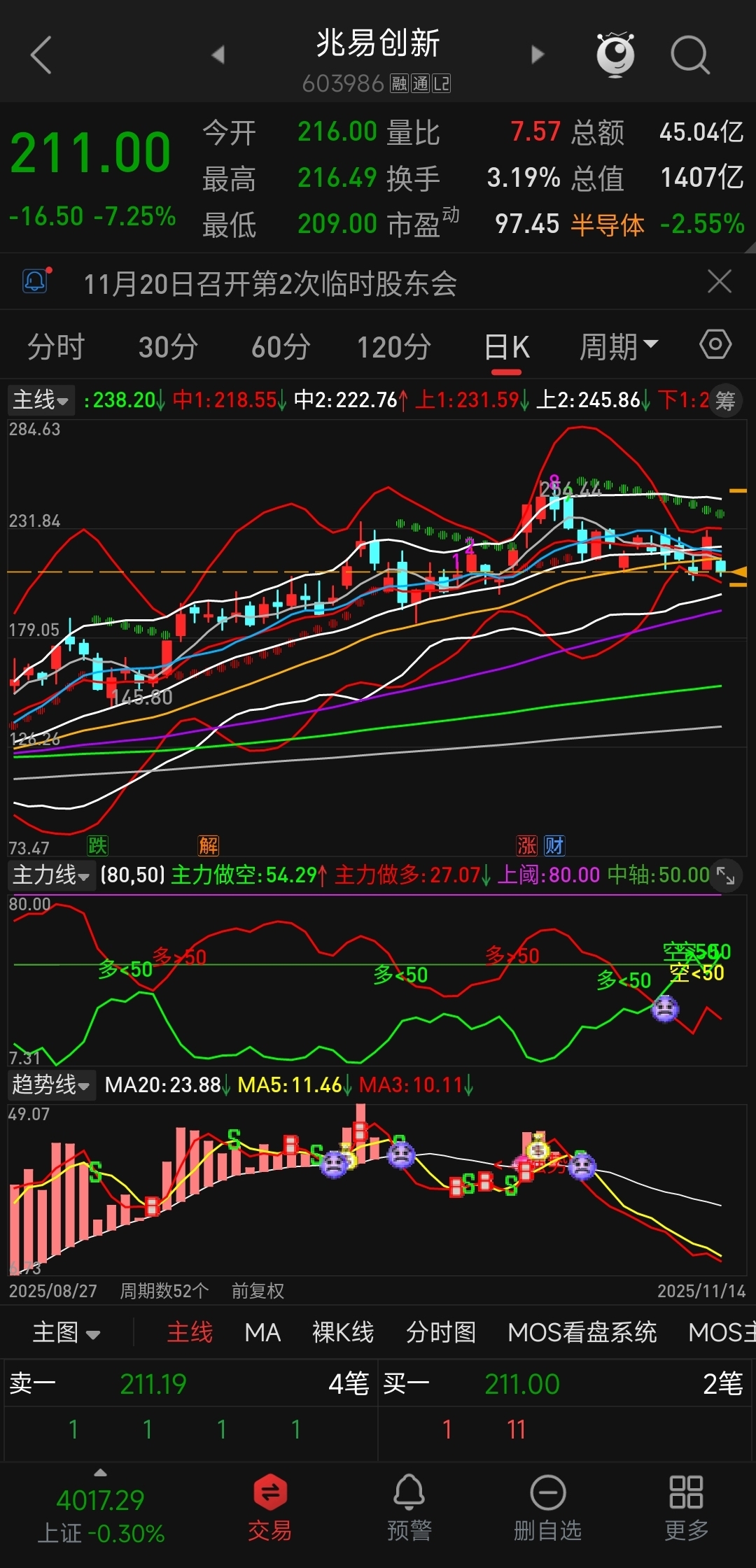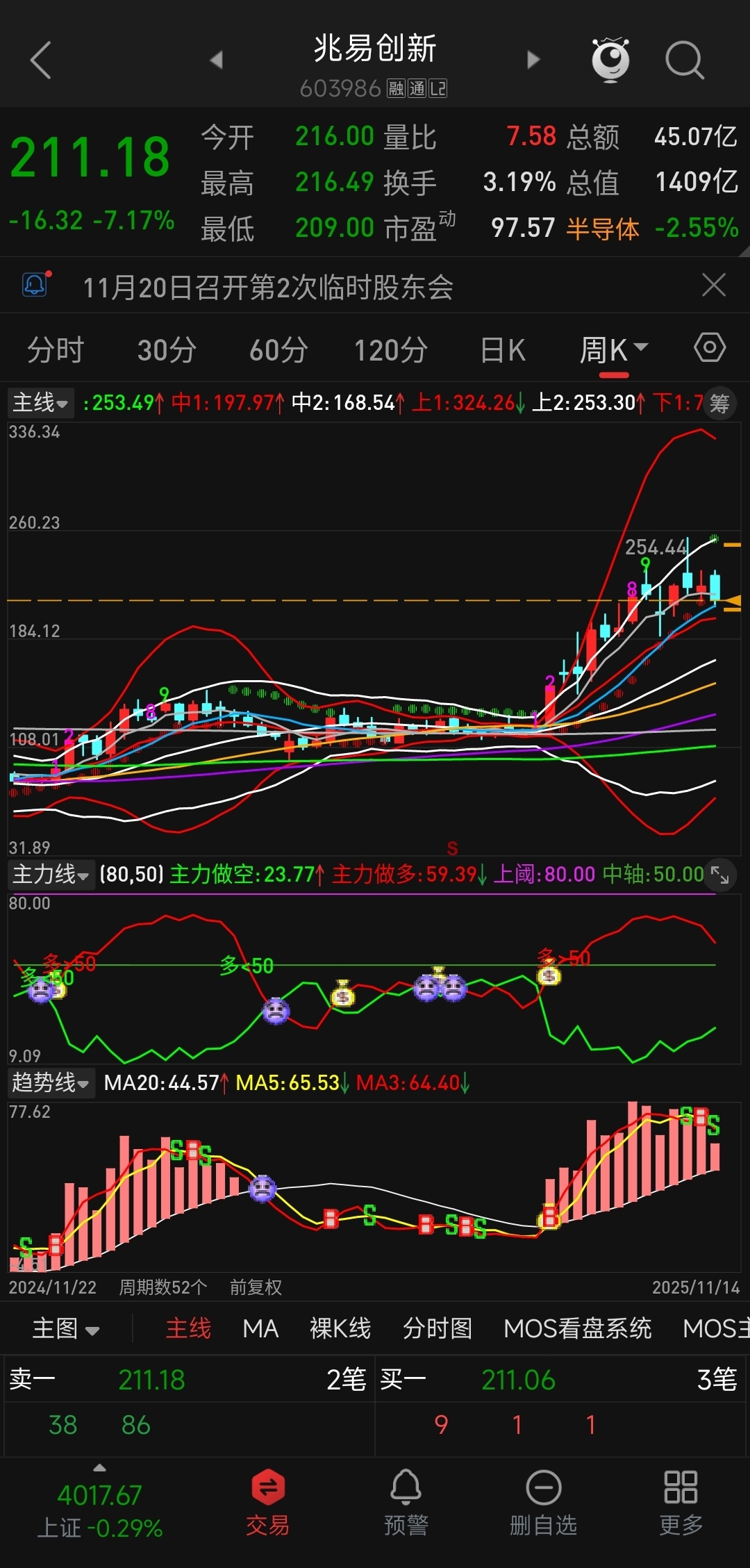 日线向下开口,主力做空线加速上行,趋势线加速下行。周线收口,主力做多线加速下坠,