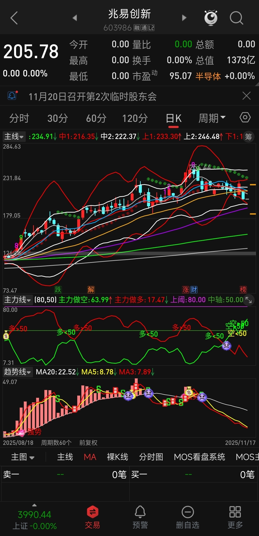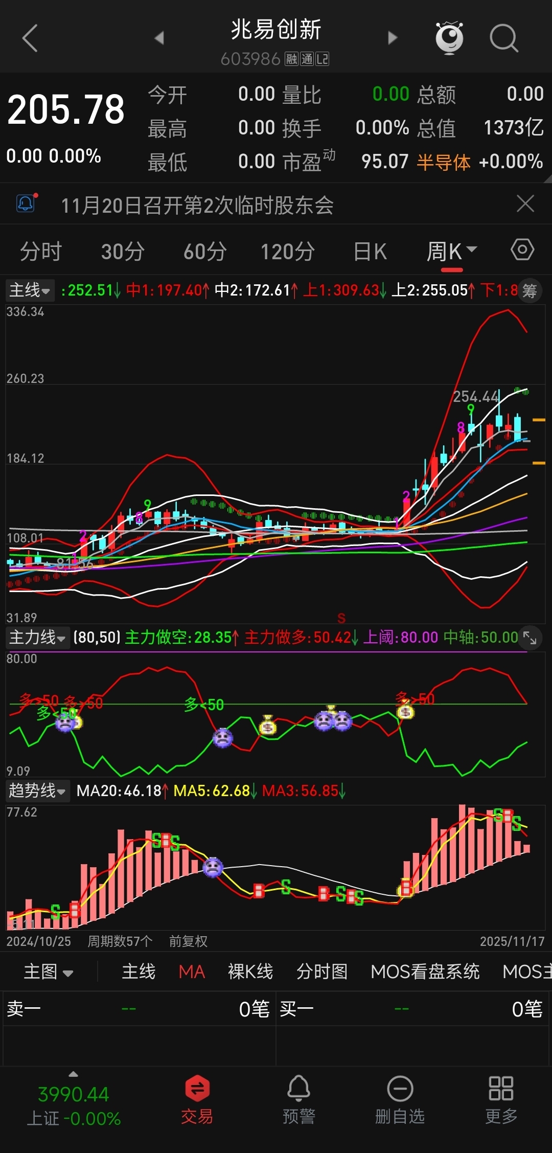 日线向下开口,主力做空线继续攀升,趋势线加速向下。周线收口,主力做多线加速下坠,