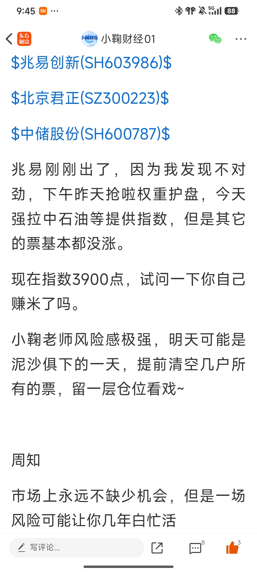 温馨提示: 1.根据《证券法》规定,禁止编造、传播虚假信息或者误导性信息,扰乱证券市场;2.用户在本社区发表的所有资料、言论等仅代表个人观点,与本网站立场无关,不对您构成任何投资建议。用户应基于自己的独立判断,自行决定证券投资并承担相应风险。《东方财富社区管理规定》