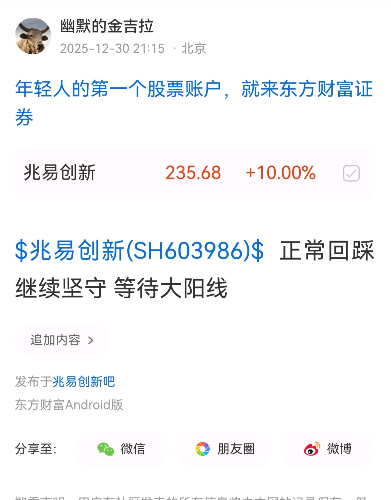 温馨提示: 1.根据《证券法》规定,禁止编造、传播虚假信息或者误导性信息,扰乱证券市场;2.用户在本社区发表的所有资料、言论等仅代表个人观点,与本网站立场无关,不对您构成任何投资建议。用户应基于自己的独立判断,自行决定证券投资并承担相应风险。《东方财富社区管理规定》
