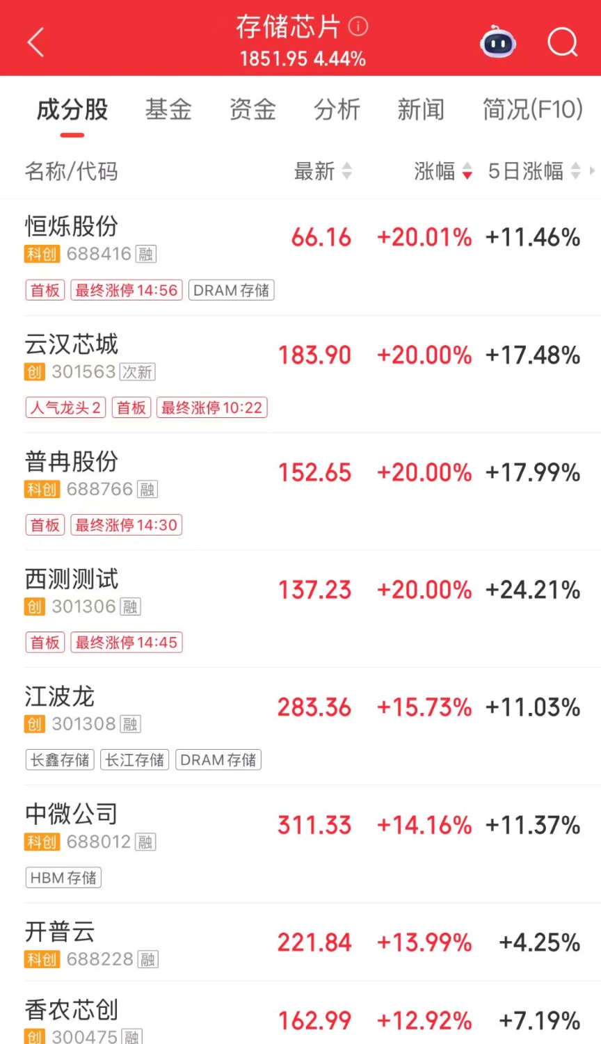 今日,存储芯片板块持续拉升,恒烁股份、云汉芯城、普冉股份、西测测试“20CM”涨停,兆易创新涨停。开普云、江波龙、中微公司等涨幅居前。