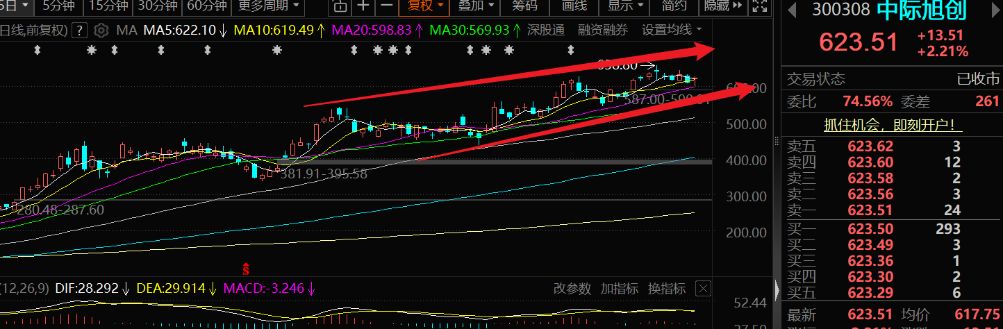 中际旭创:近期整体维持窄幅震荡走势,盘中一度回踩20日均线后快速反抽,股价重新站稳短期均线之上,量价配合到位,换手率也保持健康水平。走出金针探底收阳的形态后,多余抛压得到释放,叠加所属行业板块持续走强,若后续接力能够跟上,有望再次冲击历史高点。当前上方历史高点存在阻力,但下方均线支撑稳固,若今天能直接跳空高开,整体上升趋势将进一步。