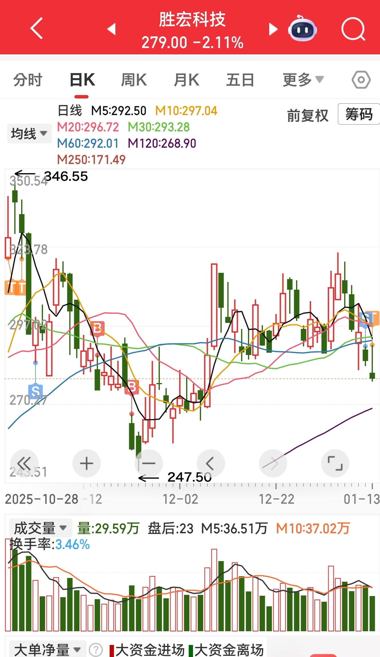 今天来说说我为什么开始降低$胜宏科技(SZ300476)$ 的仓位:首先我说过胜宏是我2026年的非卖品(不是说不可以高抛低吸),当股价(第三天)有效跌破20日多头生命线时,我就又开始要折腾了!就像我11月2日帖子里写的,二次探底我会减仓,等待246元-250元重新买回的机会,这就是技术面给我的指引,我也知行合一的严格执行了!回到1月8日当天,收盘跌破20日线,第三天1月12日我又开始了减仓,今天继续大幅降低仓位(尾盘278.5元部分回补),一是腾出现金,等待AI应用龙头个股急跌到我目前成本以下抄底的机会,因为我觉得AI应用在4月份前依然有很大机会,二是等待胜宏急跌到120日线买回的机会(再回到250元那是想多了),现在港股上市是公司最急迫的事件,不光关系到再次巨额融资,还关系到全球参与利益方的定价问题,所以股价300元会是发行前一条无形的红线,八折定价240港元左右符合公司和某些国际投行的利益!说我菜也好,没水平也罢,这就是我自己的技术认知,这就是我的执行力!