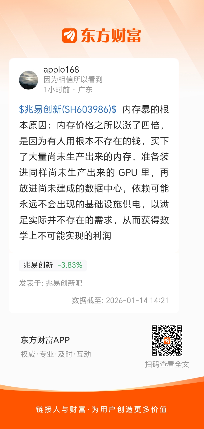 $兆易创新(SH603986)$ 内存暴的根本原因:内存价格之所以涨了四倍,是因为有人用根本不存在的钱,买下了大量尚未生产出来的内存,准备装进同样尚未生产出来的 GPU 里,再放进尚未建成的数据中心,依赖可能永远不会出现的基础设施供电,以满足实际并不存在的需求,从而获得数学上不可能实现的利润