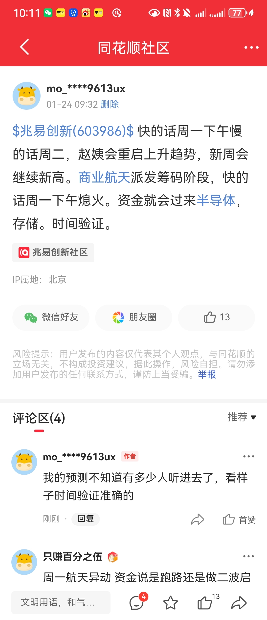 温馨提示: 1.根据《证券法》规定,禁止编造、传播虚假信息或者误导性信息,扰乱证券市场;2.用户在本社区发表的所有资料、言论等仅代表个人观点,与本网站立场无关,不对您构成任何投资建议。用户应基于自己的独立判断,自行决定证券投资并承担相应风险。《东方财富社区管理规定》