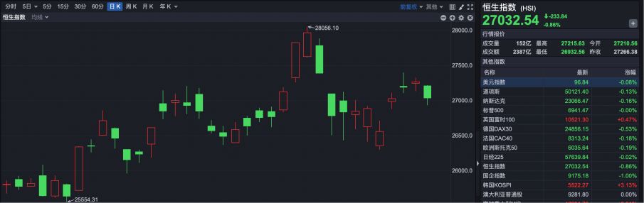 截至收盘,恒生指数报27032.54点,下跌233.84点,跌幅0.86%。