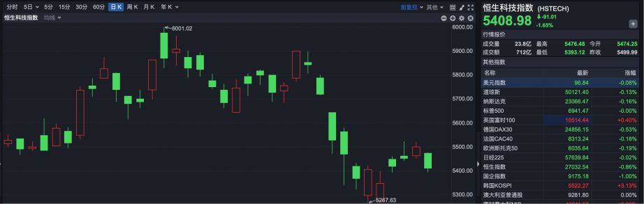 恒生科技指数收盘报5408.98点,下跌91.01点,跌幅1.65%。