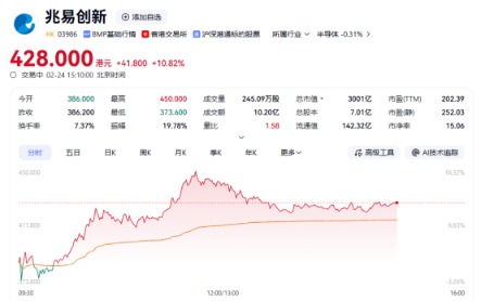上证报中国证券网讯2月24日,兆易创新H股股价冲高回落,盘中一度报450港元/股,再创新高。截至15时10分,公司股价上涨10.82%,报428港元/股。