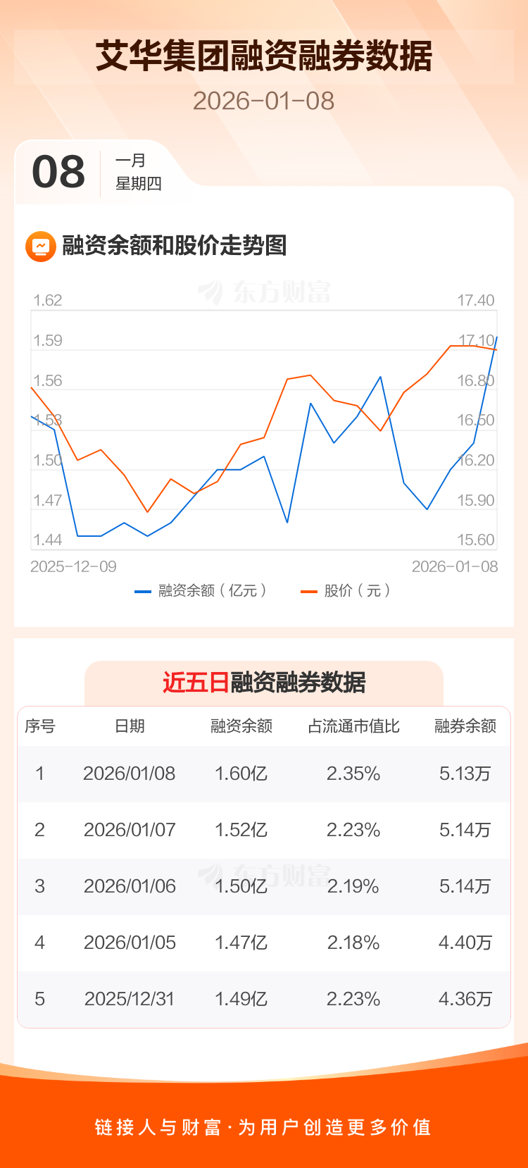 交易所最新数据显示,艾华集团于2026年1月8日获融资买入1686.65万元,融资偿还883.60万元,当日融资净买入803.05万元。目前,该股融资余额1.60亿,占流通市值比例为2.35%。
