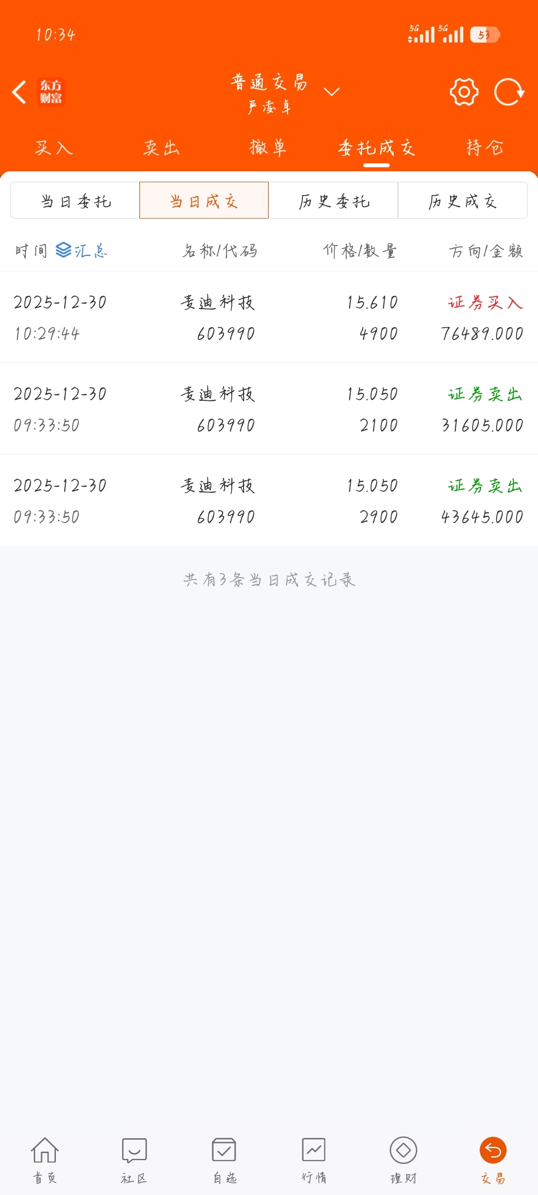 $麦迪科技(SH603990)$ 本来15.05卖掉了,挂14.91,结果看他掉的太快了,就把取消掉了,结果最后他长得太快了,我又不敢进,最后15.61才进,瞎操作少了一手的,不动就能多挣2500