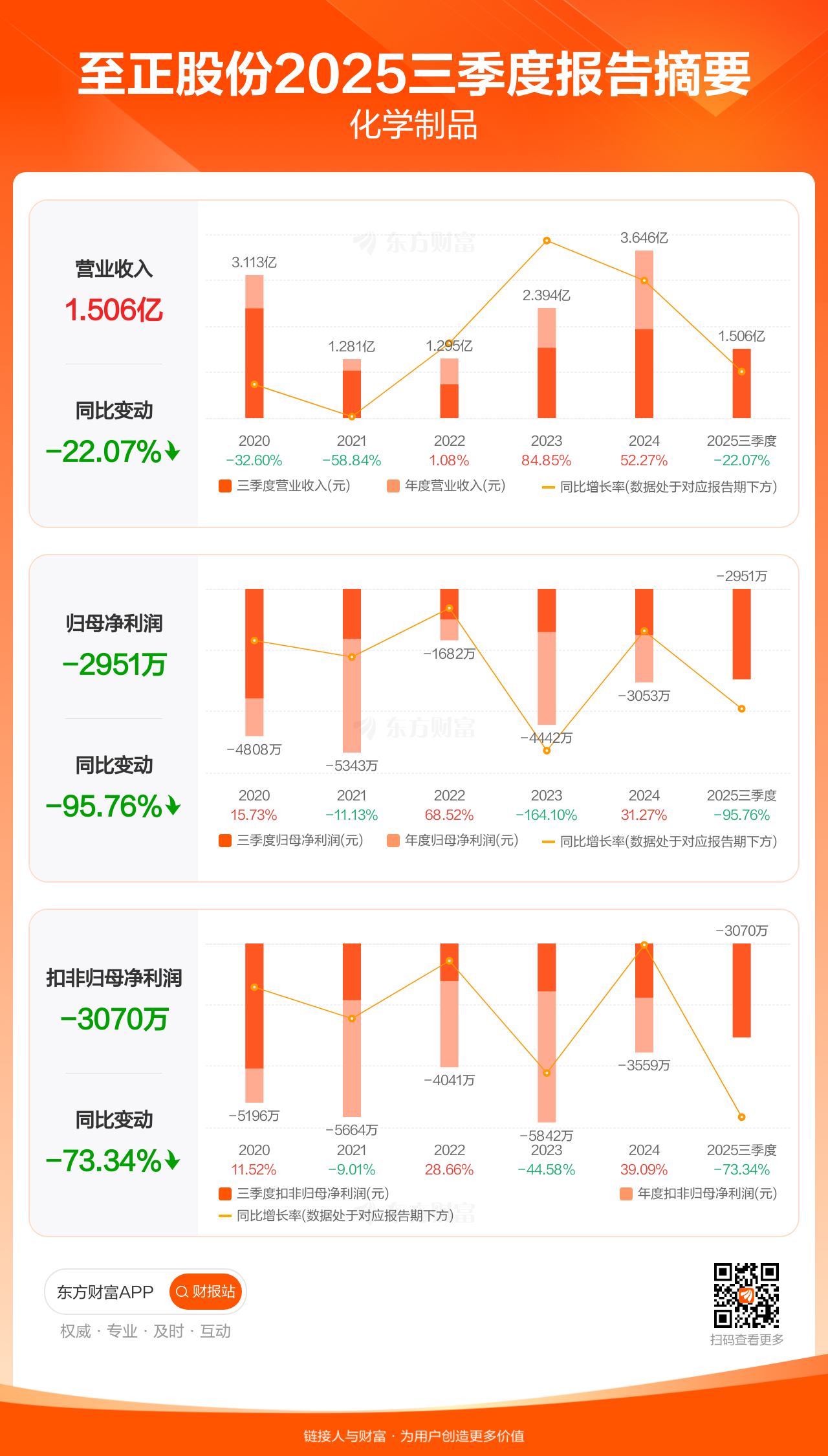 至正股份10月30日发布2025年三季报显示,公司前三季实现营业收入1.51亿元,同比下滑22.07%;归母净利润-2951.06万元;扣非归母净利润-3069.89万元。