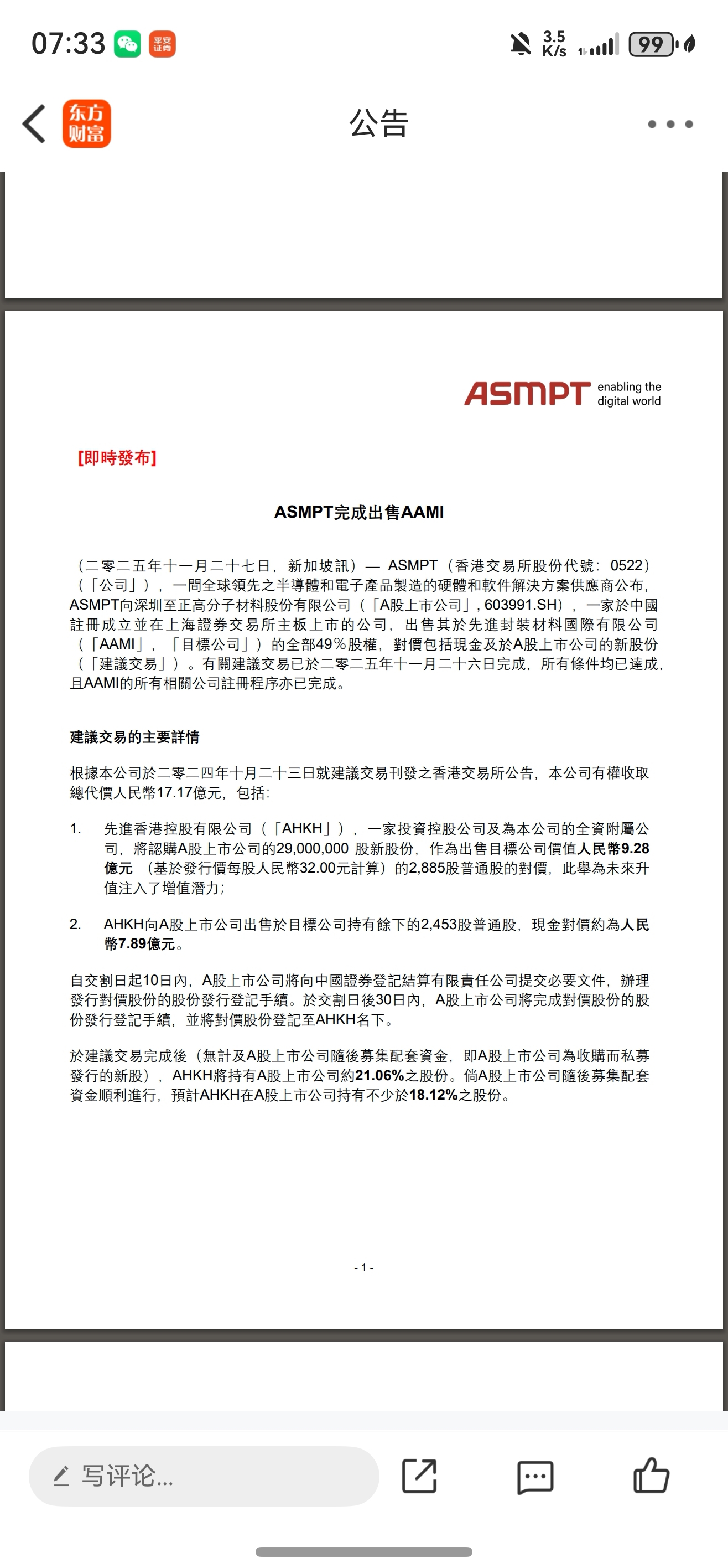 $至正股份(SH603991)$ asmpt 已经发布公告,交易完成