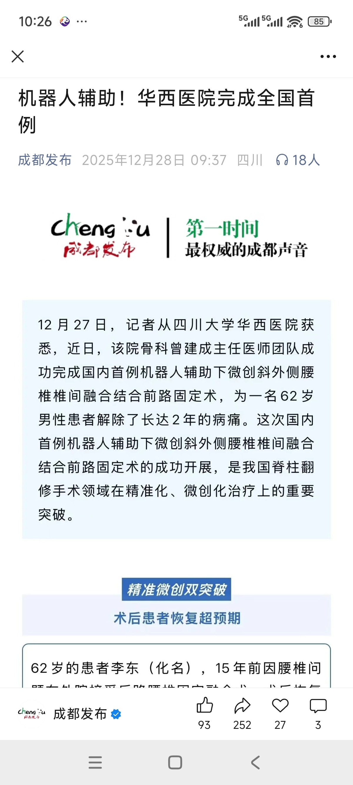 $松霖科技(SH603992)$ 华西医院机器人辅助做手术,机器人利好消息。