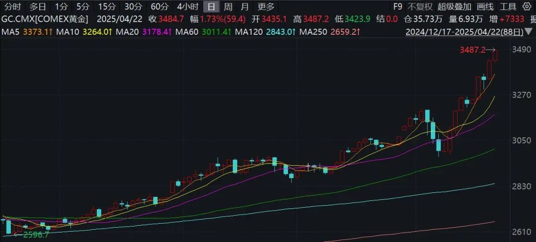 4月22日,COMEX黄金价格最高已达到3482.7美元/盎司,再度刷新历史高点,年内涨幅已超过32%。而国内市场上,沪金主力合约2506最高已逼近830元/克。