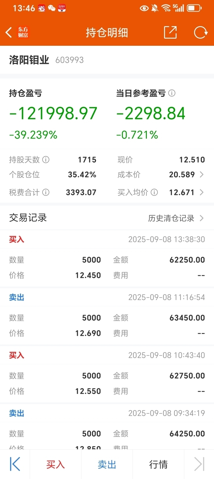 五年了,曾经赚钱没卖,八块跌到四块割肉,本次补仓做差价,20250901开始,投入20万元,20万元做差价,也有跌到12块多的时候割肉,差价做错。