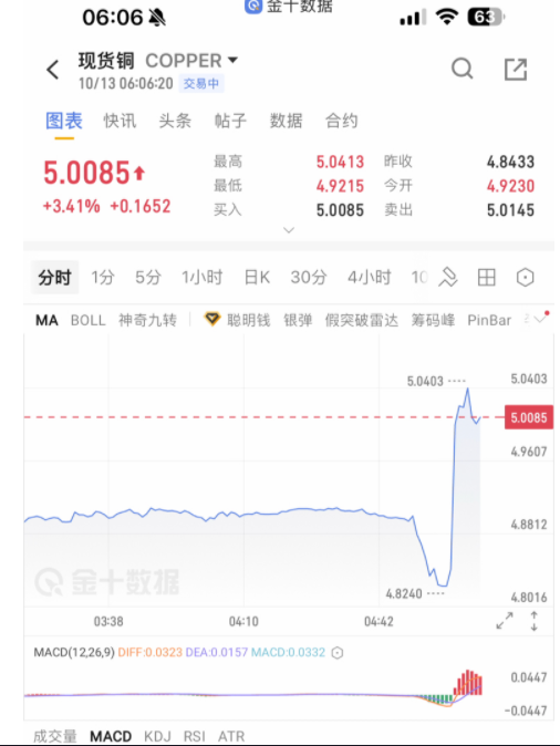 现在10月13日7:26分铜暴涨10% 阳包阴冲天巨阳!收复周四周五全部跌幅创历史新高!