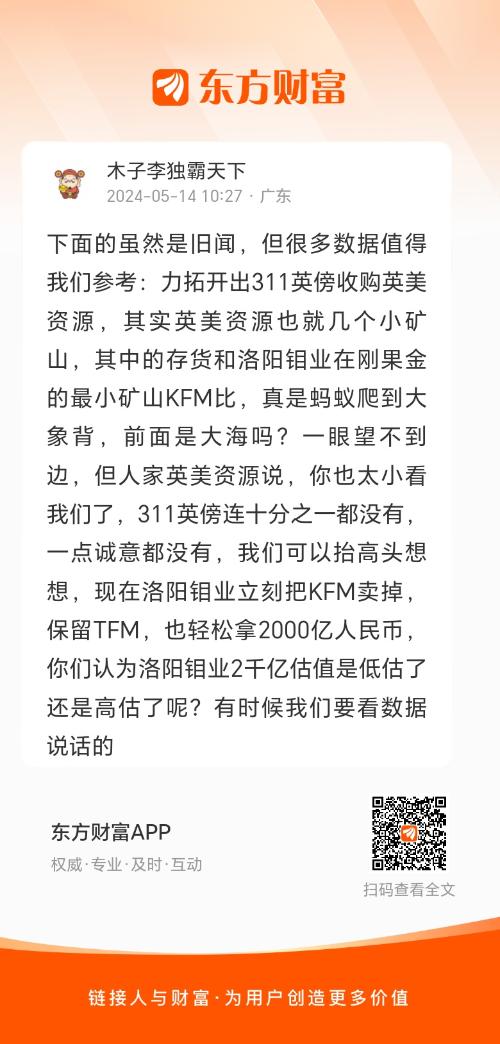 下面的虽然是旧闻,但很多数据值得我们参考:力拓开出311英傍收购英美资源,其实英美资源也就几个小矿山,其中的存货和洛阳钼业在刚果金的最小矿山KFM比,真是蚂蚁爬到大象背,前面是大海吗?一眼望不到边,但人家英美资源说,你也太小看我们了,311英傍连十分之一都没有,一点诚意都没有,我们可以抬高头想想,现在洛阳钼业立刻把KFM卖掉,保留TFM,也轻松拿2000亿人民币,你们认为洛阳钼业2千亿估值是低估了还是高估了呢?有时候我们要看数据说话的